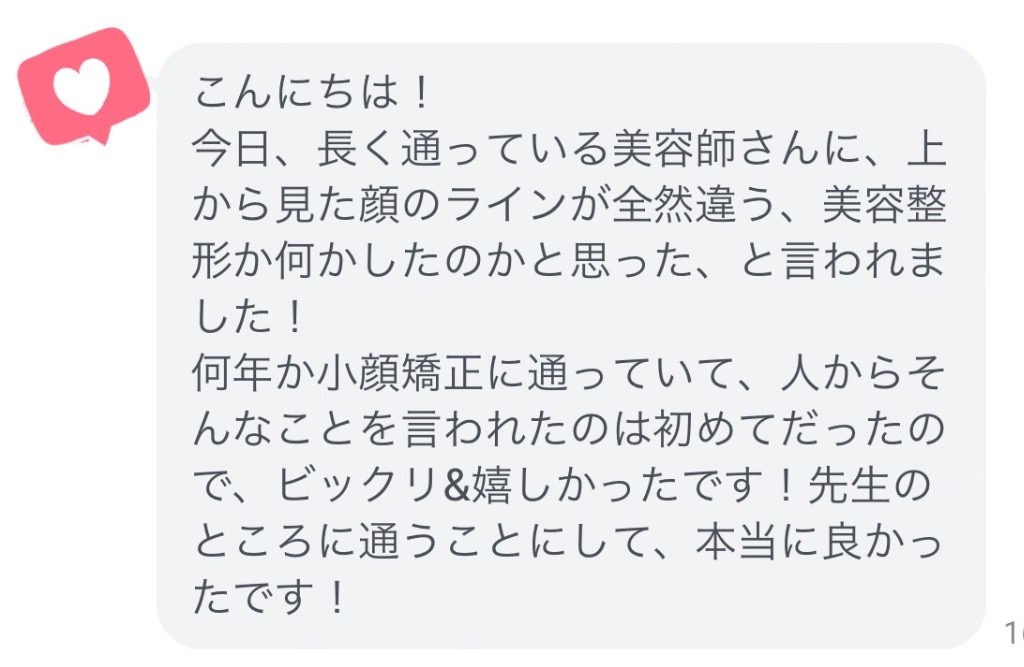 何年か小顔矯正に通っていて、人からそんなことを言われたのは初めてだったので、ビックリ&嬉しかったです!先生のところに通うことにして、本当に良かったです!