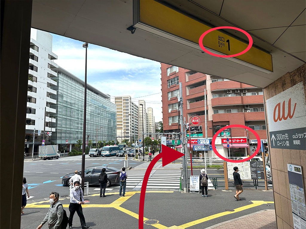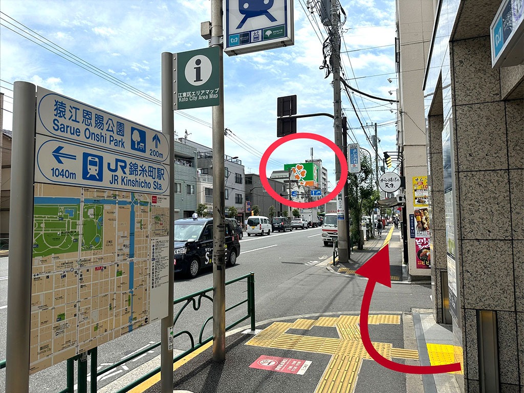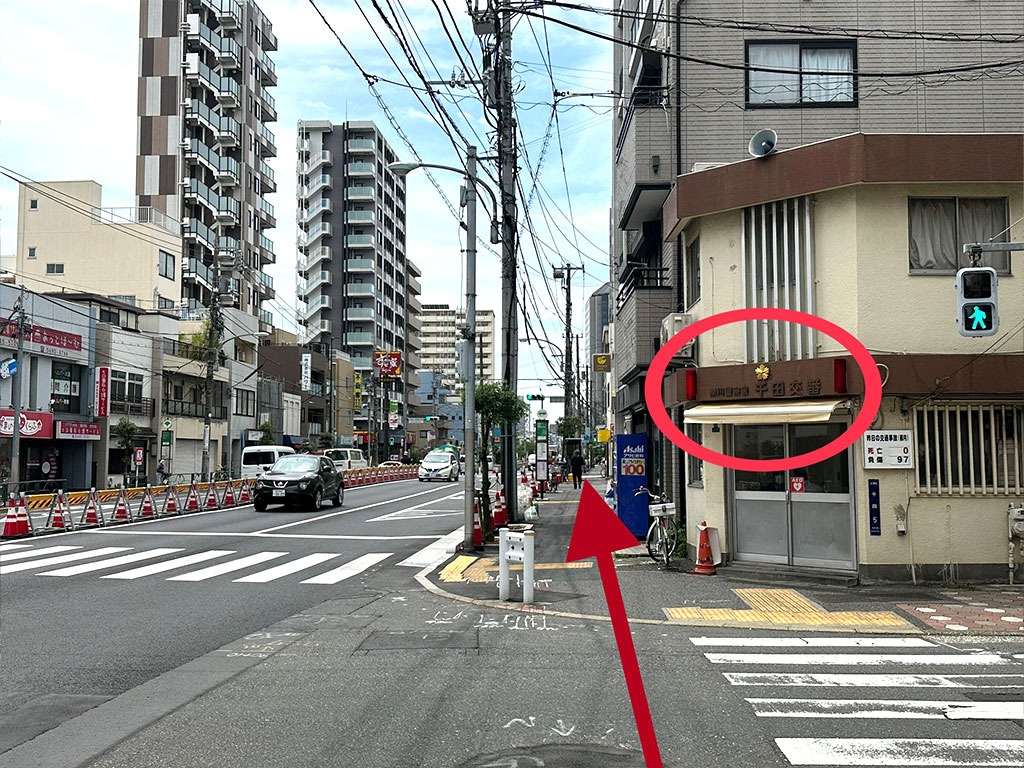 ② 出口1を出ましたら真っ直ぐ信号を渡り右折します。
