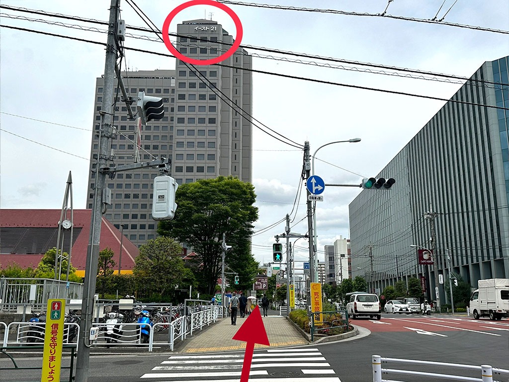 ⑤ 左前方に「イースト21」が見えてきます。そのまま直進します。