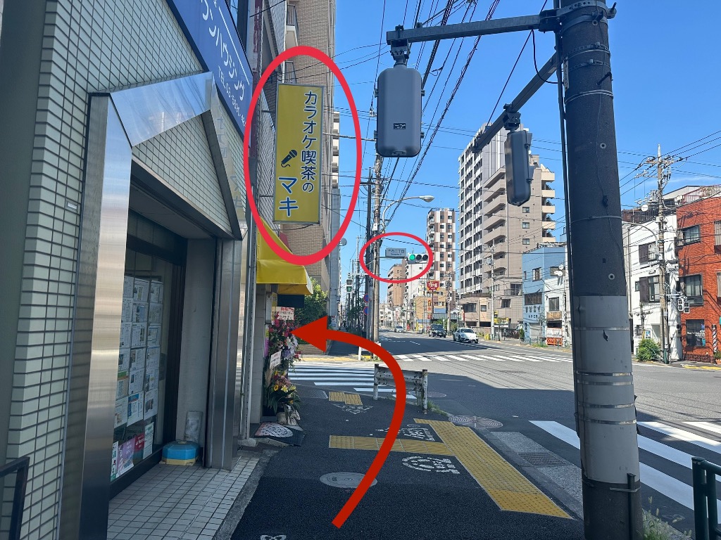 その先「カラオケ喫茶のマキ」の黄色の看板が見えます。