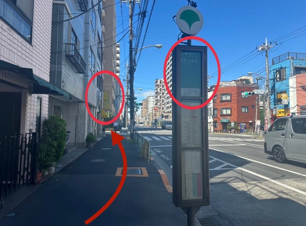 ⑦ 最初①の「コージーコーナー」からここまで約12分直進して来ますと『千石二丁目』のバス停があります。