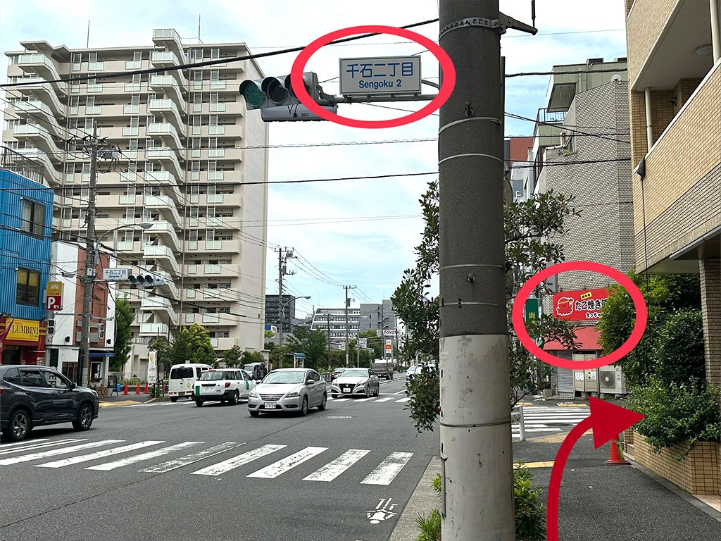 ⑧ この「千石二丁目」の交差点を渡りすぐ左に曲がると徒歩30秒でサロンのあるマンションです。