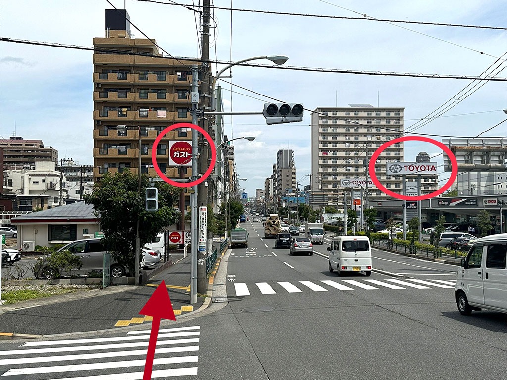⑥ 大きな通り(葛西橋通り)を渡って直進しますと左に「ガスト」、右前方に「トヨタTOYOTA」が見えてきます。さらに直進してください。